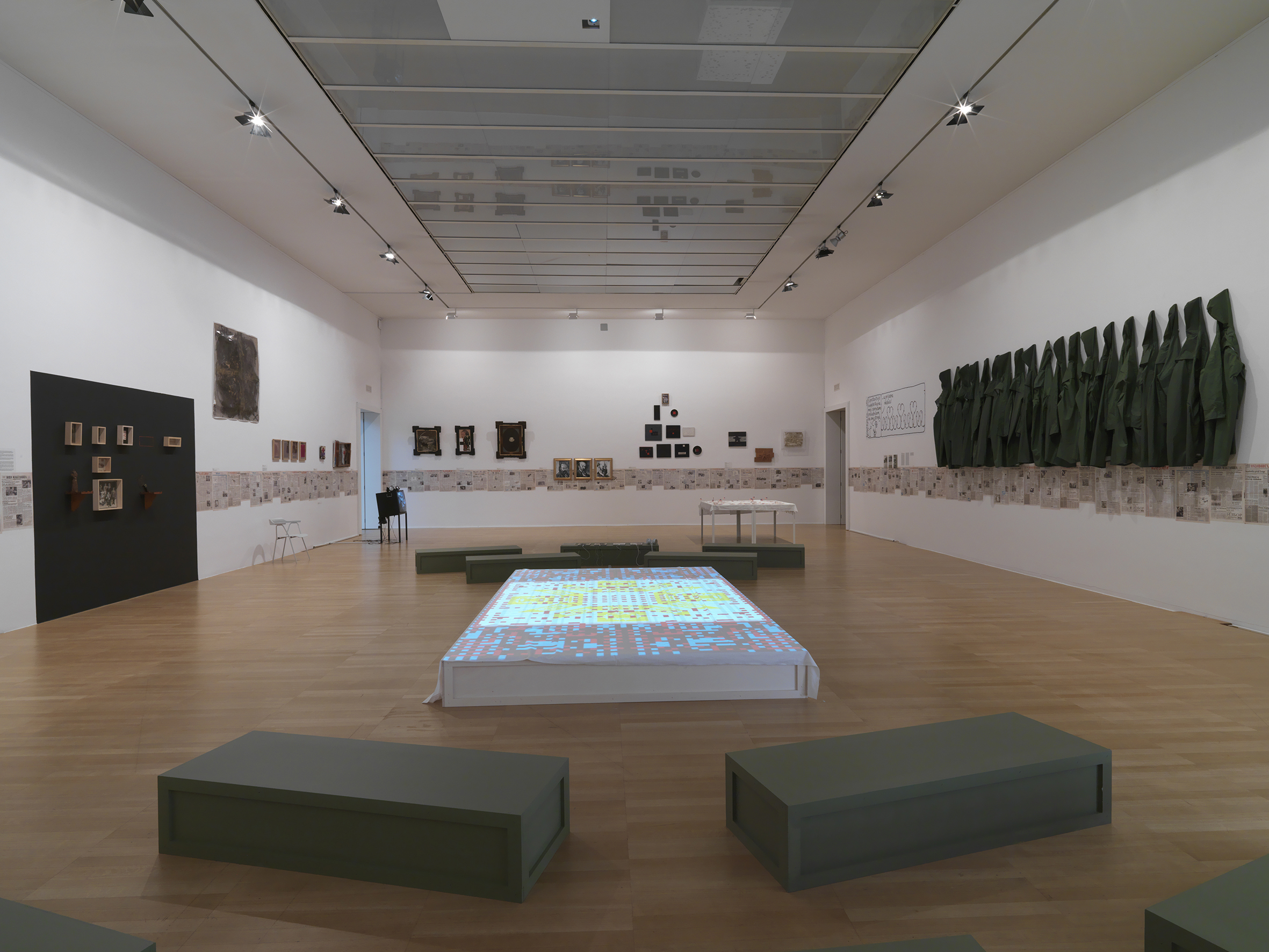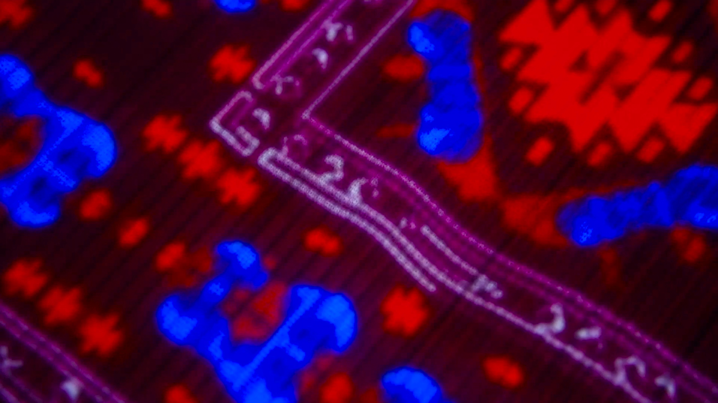 Each of these periods translates into a layer of the palimpsestic carpet. [ … ] more and more symbols are added to the carpet, while others are revised or erased. The largest, central space of the exhibition focuses on the period of the War of 1992–95 as well as on the now, represented through an analog / digital carpet in the center of the space. This carpet brings together the constantly changing digital animation of all of these patterns from all exhibition rooms with the realtime crisis of the commons' heritage today and in the future. "