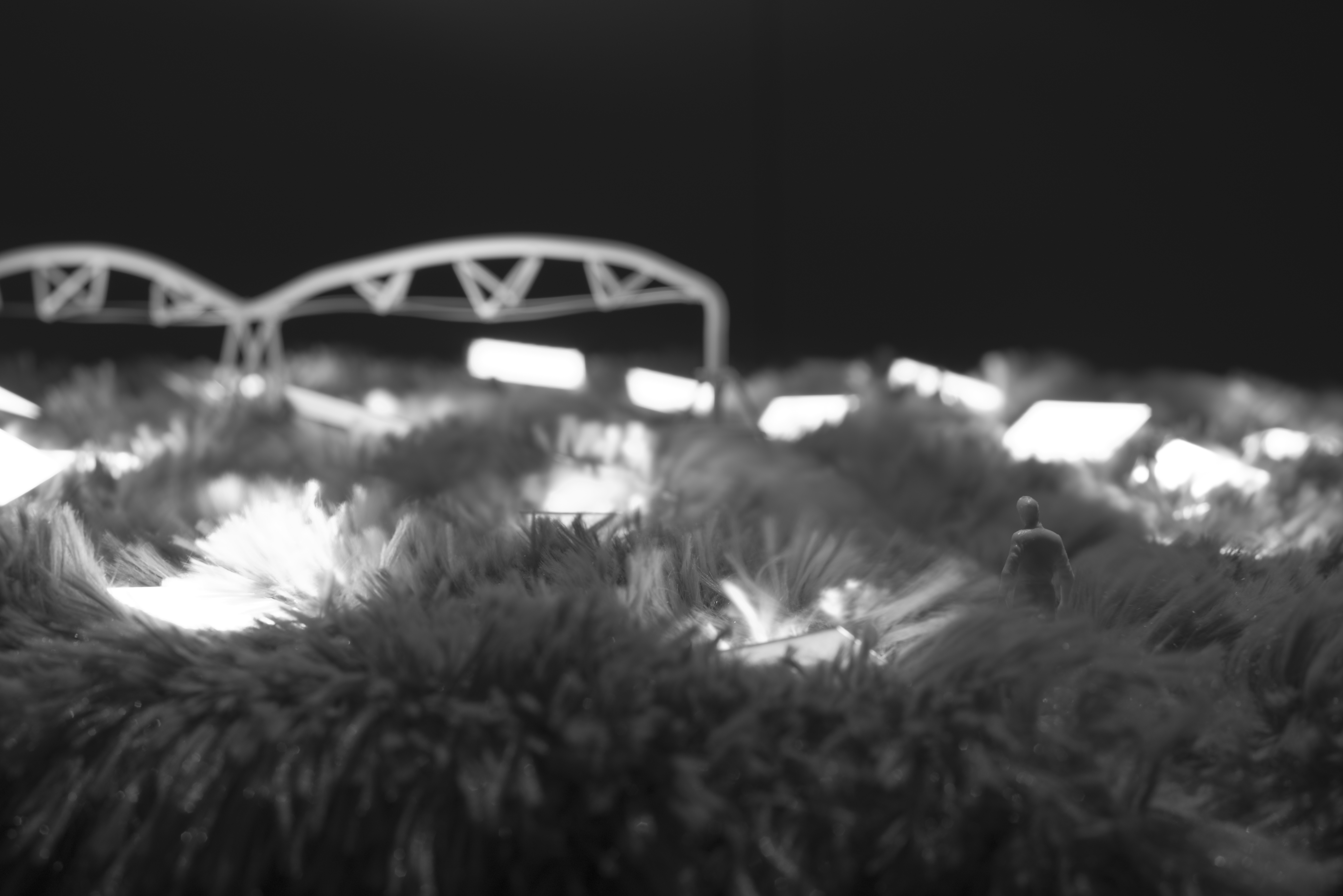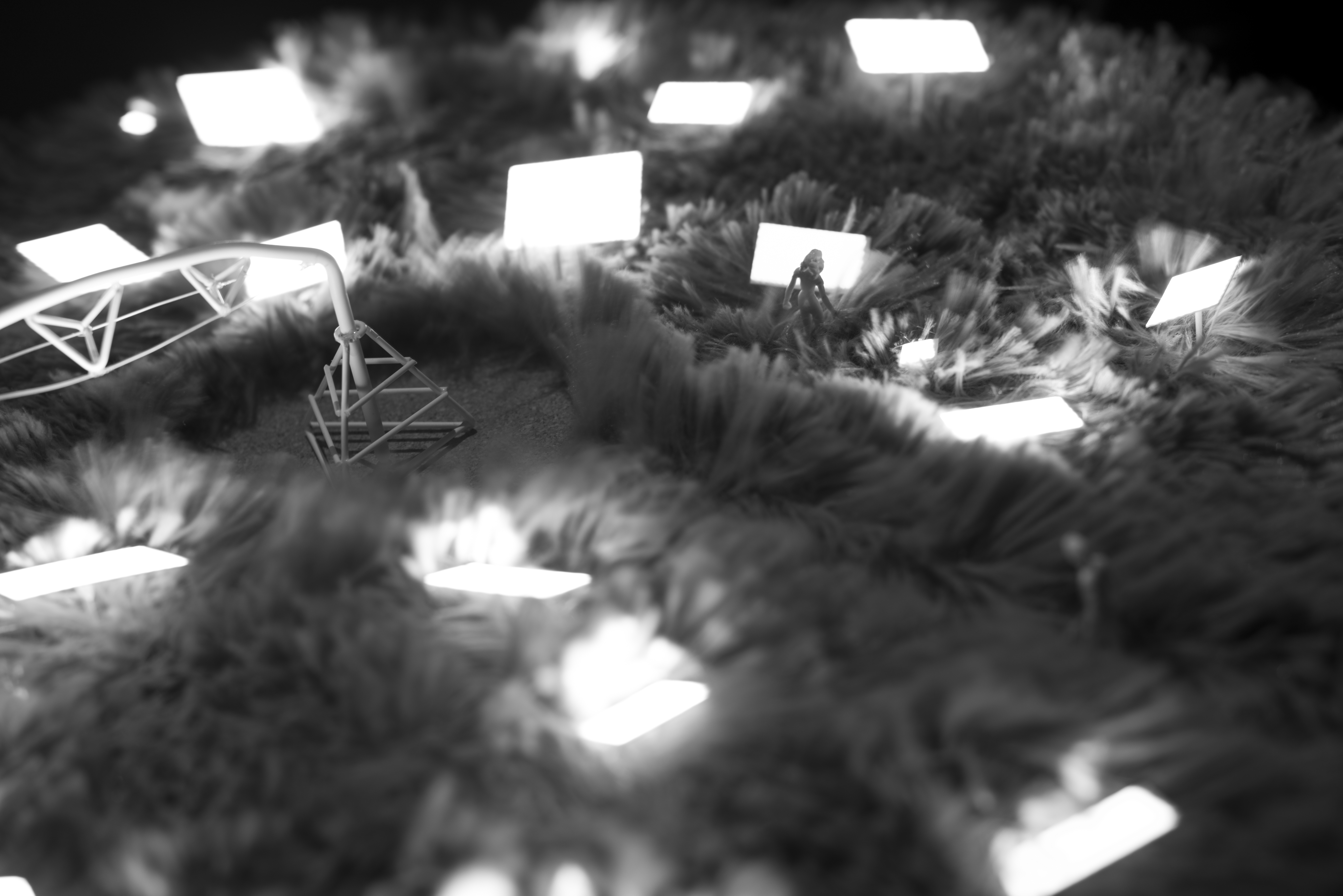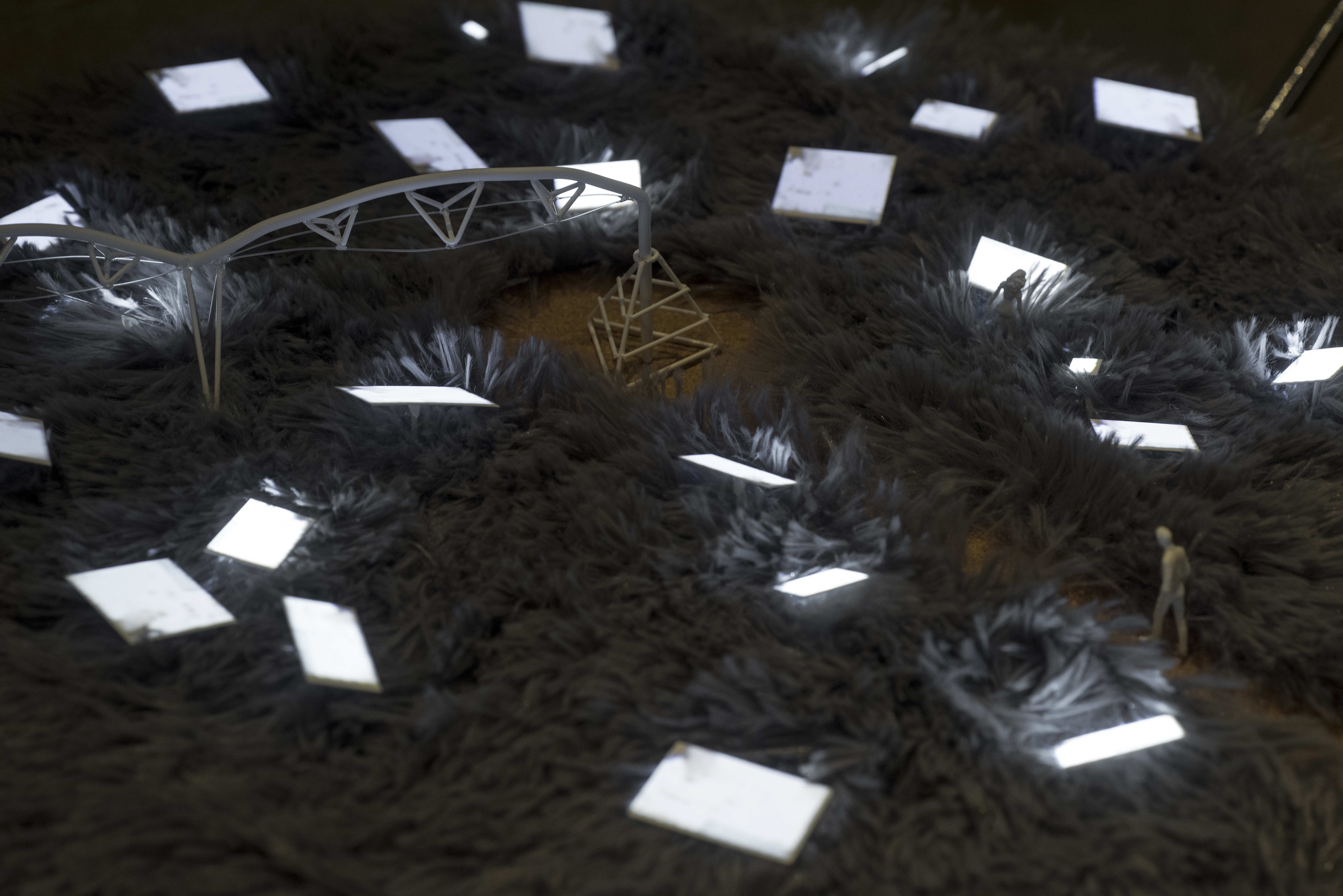 The Field Studies series explores these questions through a number of model-scale vignettes composed with a decidedly simple and accessible formal vocabulary of miniature human figures, light-emitting screens, and landscapes. Each scene depicts an existing or alternative display form, and the associated societal organizations each form dictates. These scenes include fields of isolated mobile users, celebrations of massive media monuments, riots of individuals armed with media-weapons, and speculative utopian landscapes populated with numerous alternative media forms.