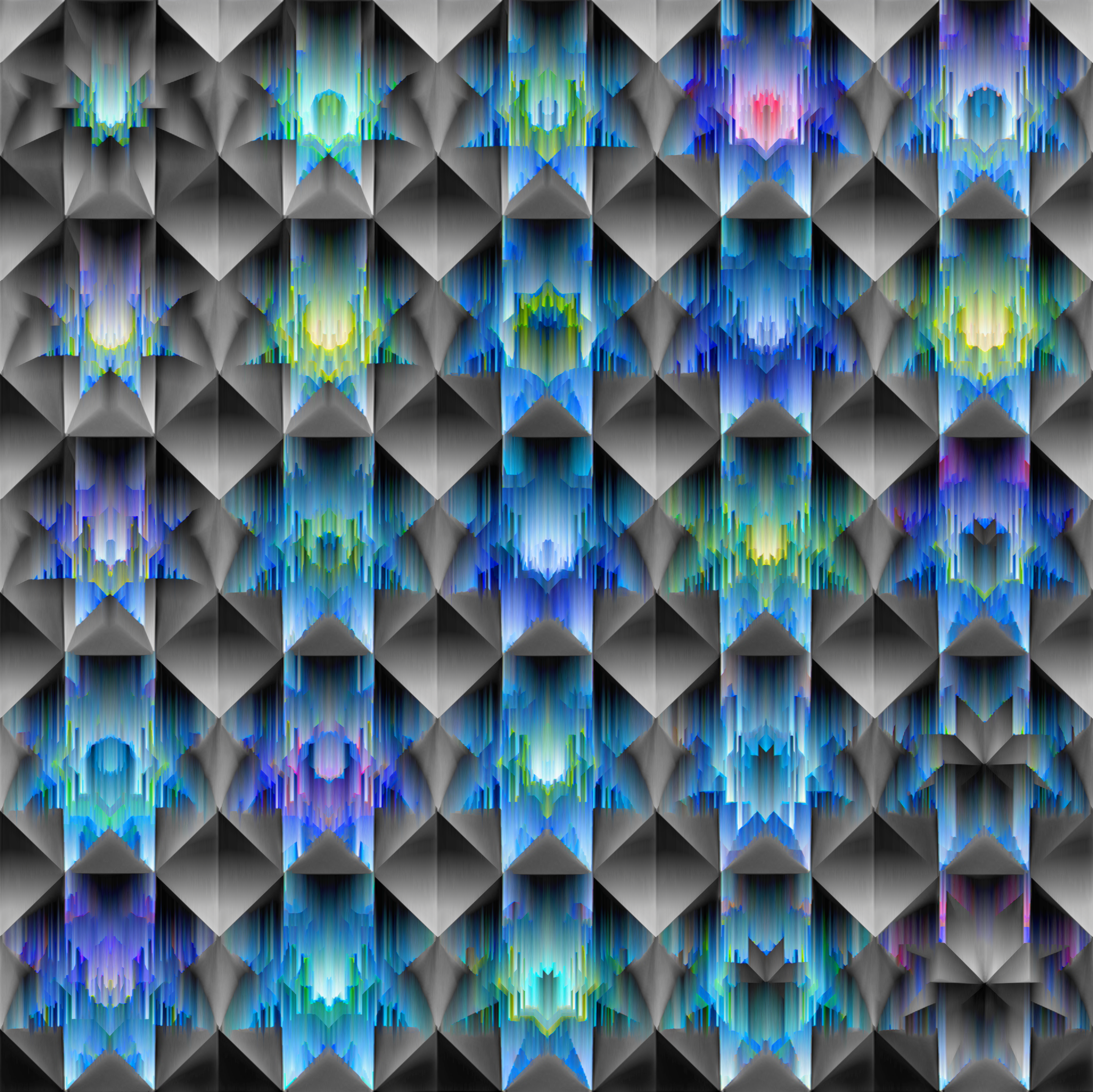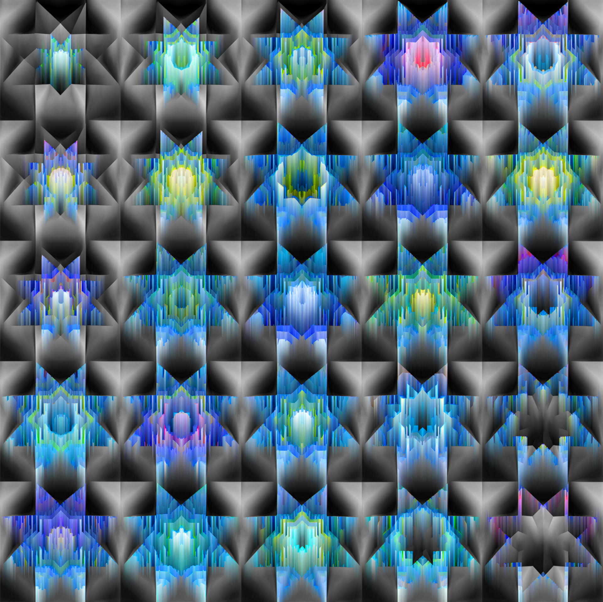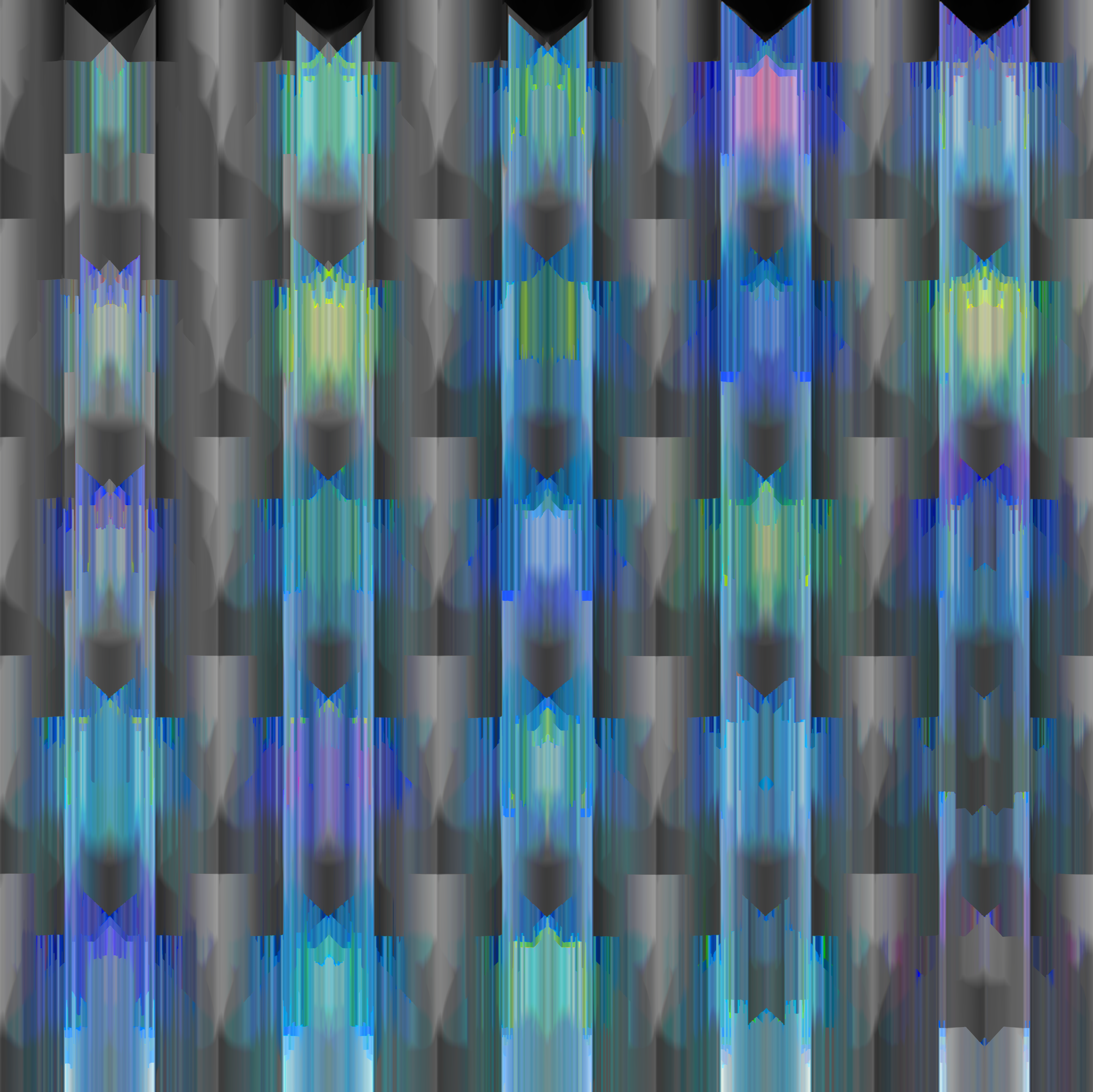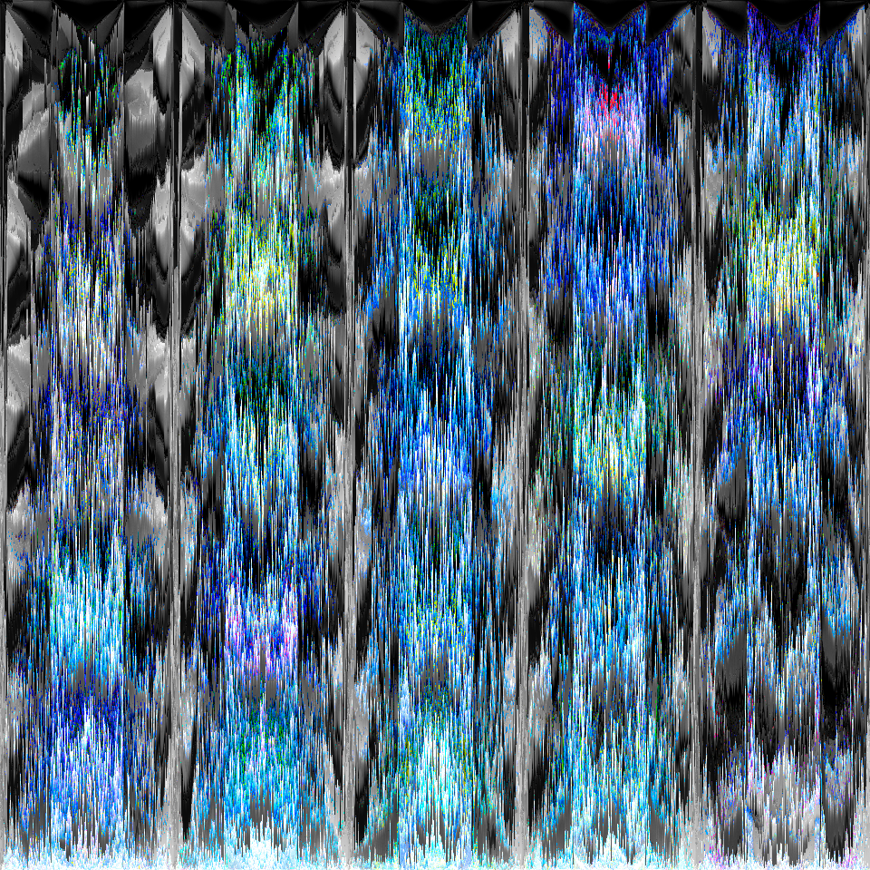 GIRIHGLITCH is a line of image-processing exploration that emerged from the photo documentation of AWESCOPE. Frames of the animated sculpture were arranged in sequence to create a tiling pattern (seen below). This image was used to test various image processing techniques used to produce "glitched" visuals.