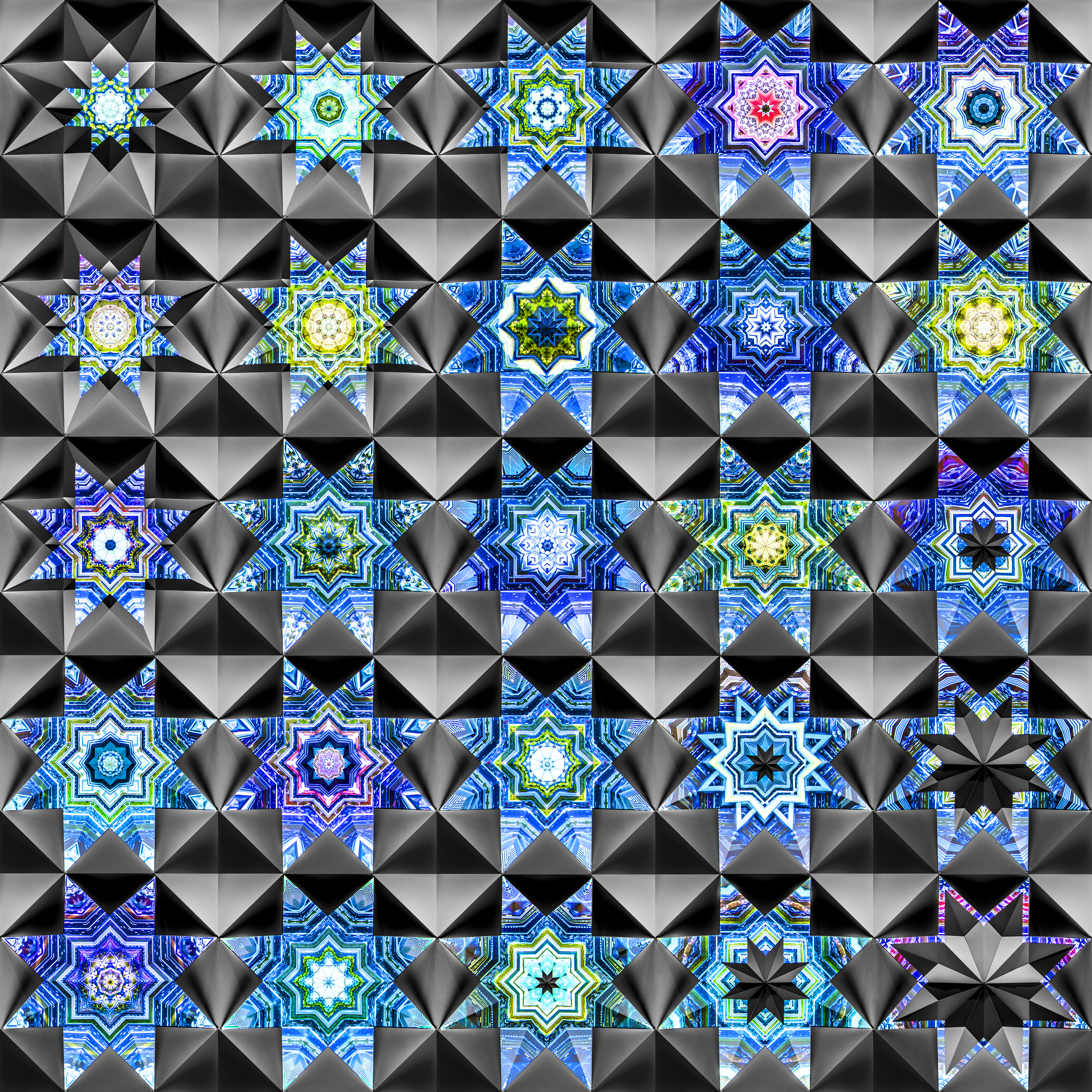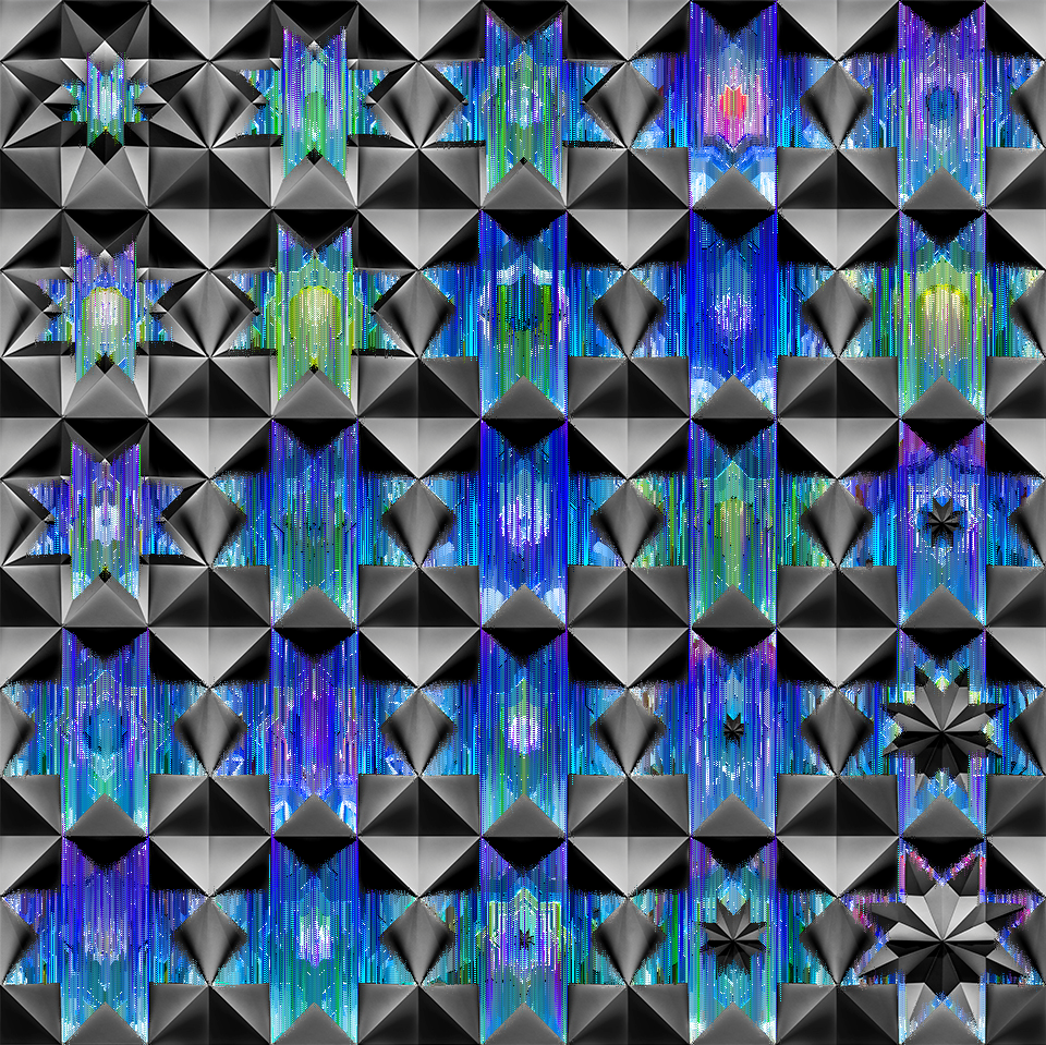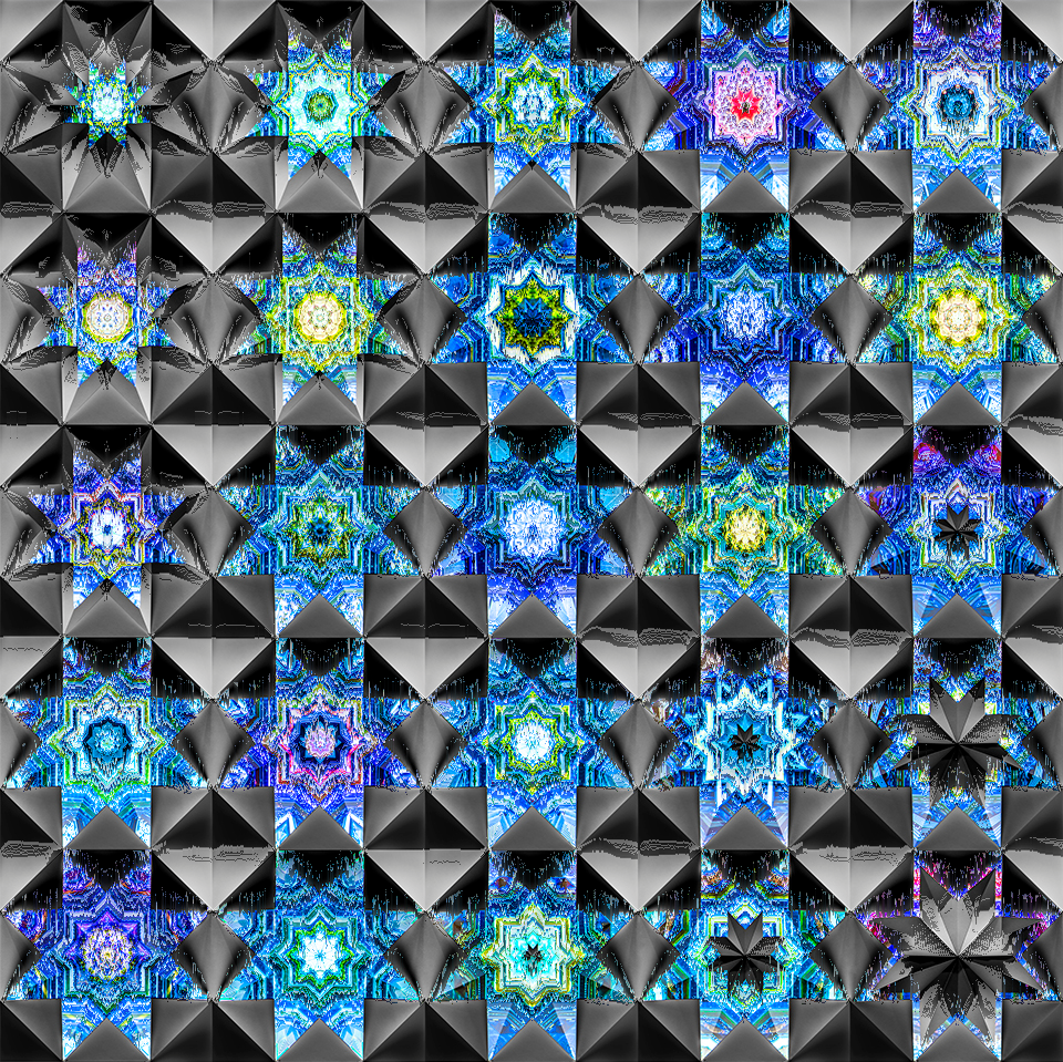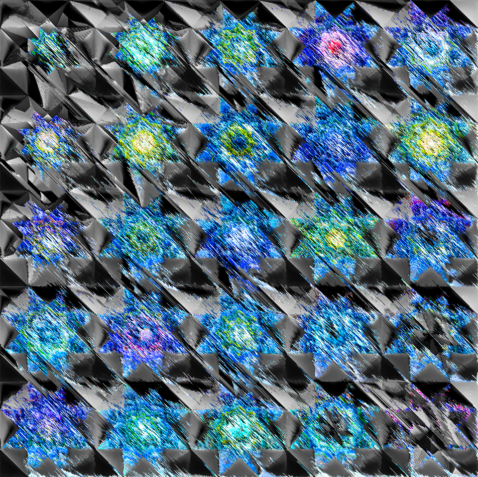 GIRIHGLITCH is a line of image-processing exploration that emerged from the photo documentation of AWESCOPE. Frames of the animated sculpture were arranged in sequence to create a tiling pattern (seen below). This image was used to test various image processing techniques used to produce "glitched" visuals.